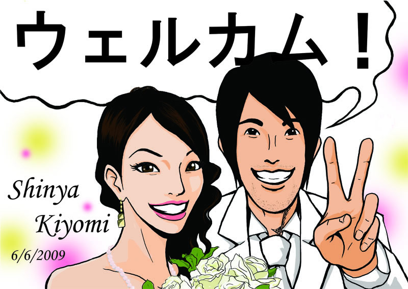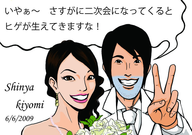 友人の結婚式のウェルカムボードを描きました。新郎は披露宴が終わる頃にはヒゲが生えてきて、2次会の頃には青ひげが…という漫画的要素を無理やり込めた作品です。披露宴に出席し、二次会にも出席した方には受けました。新郎は「おい!」と怒ってました。